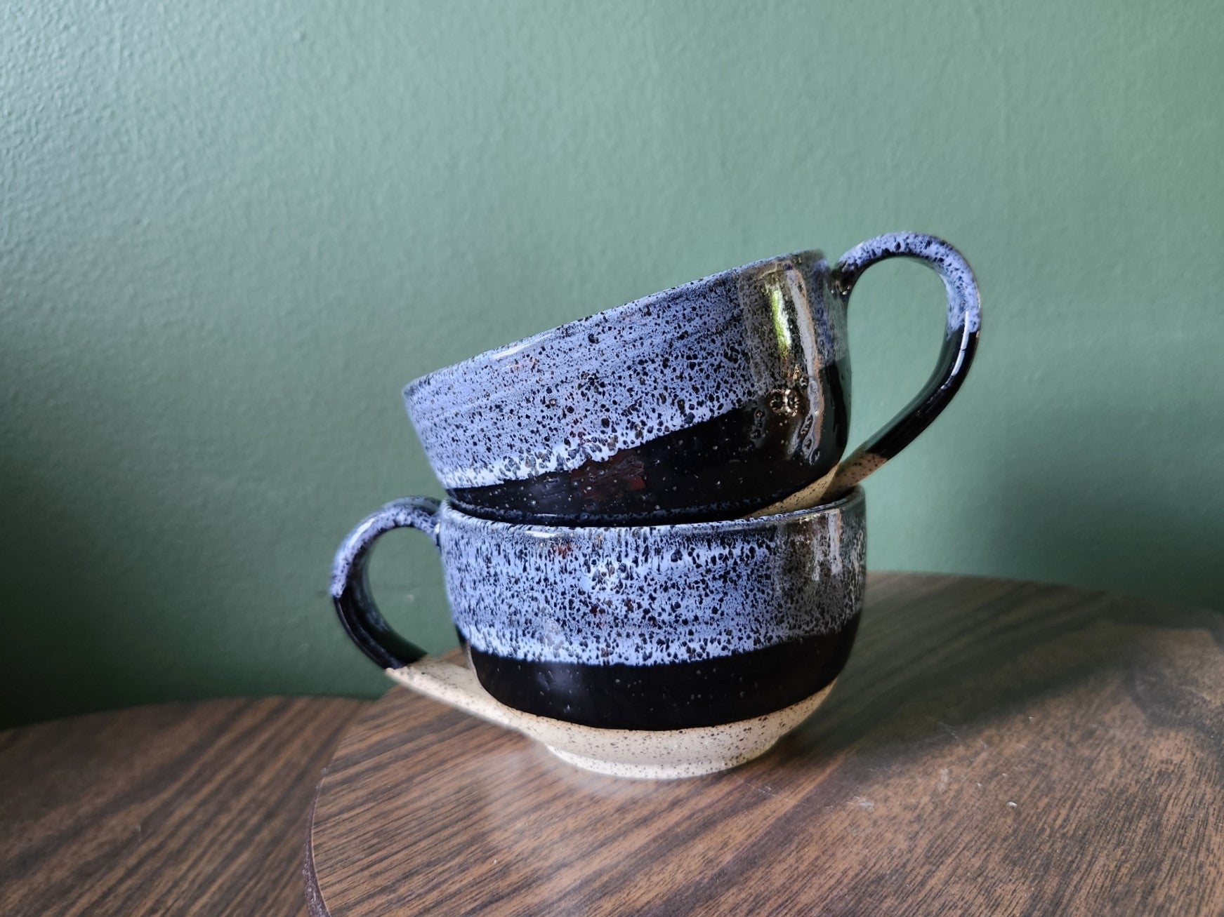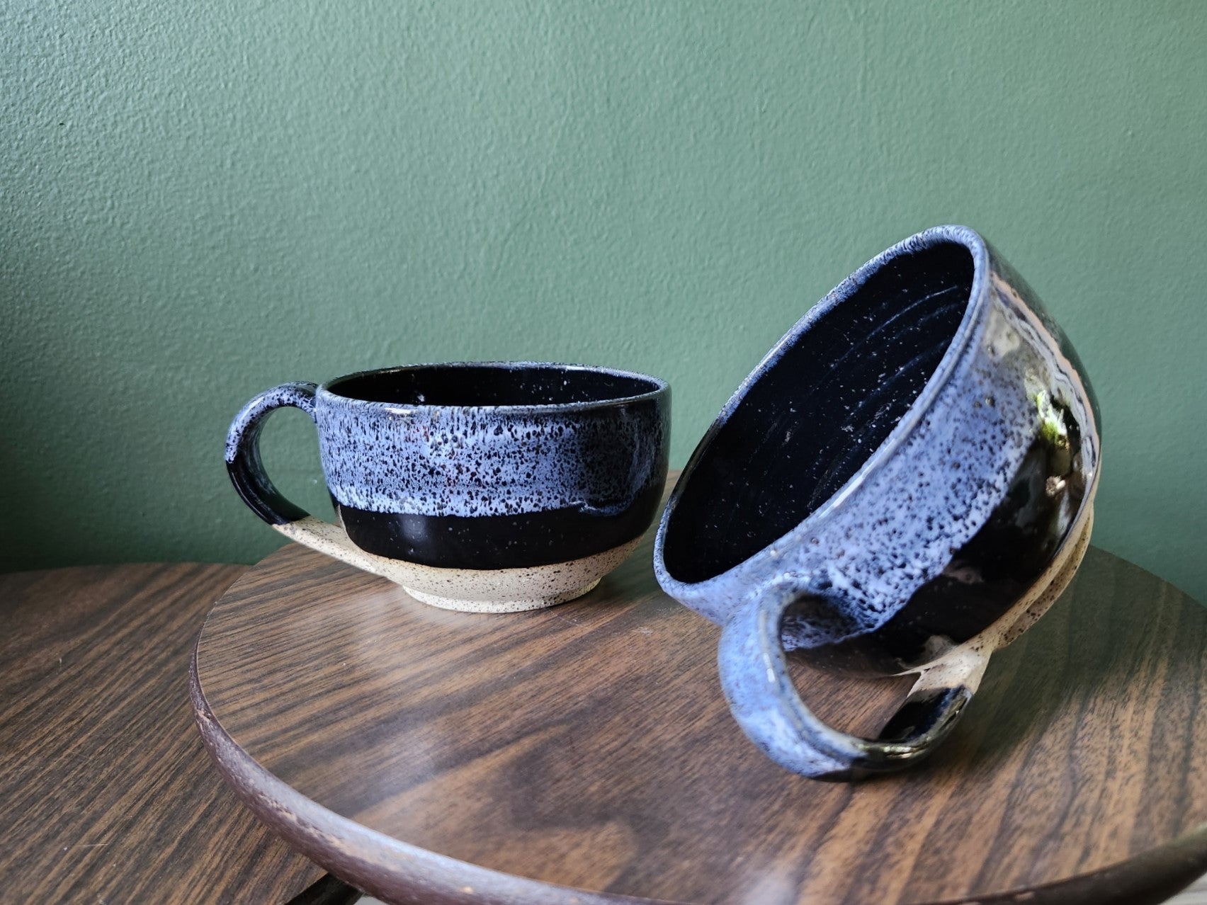 These café cups are handmade, using a potters wheel and various glazes. 2 cups included in the set.