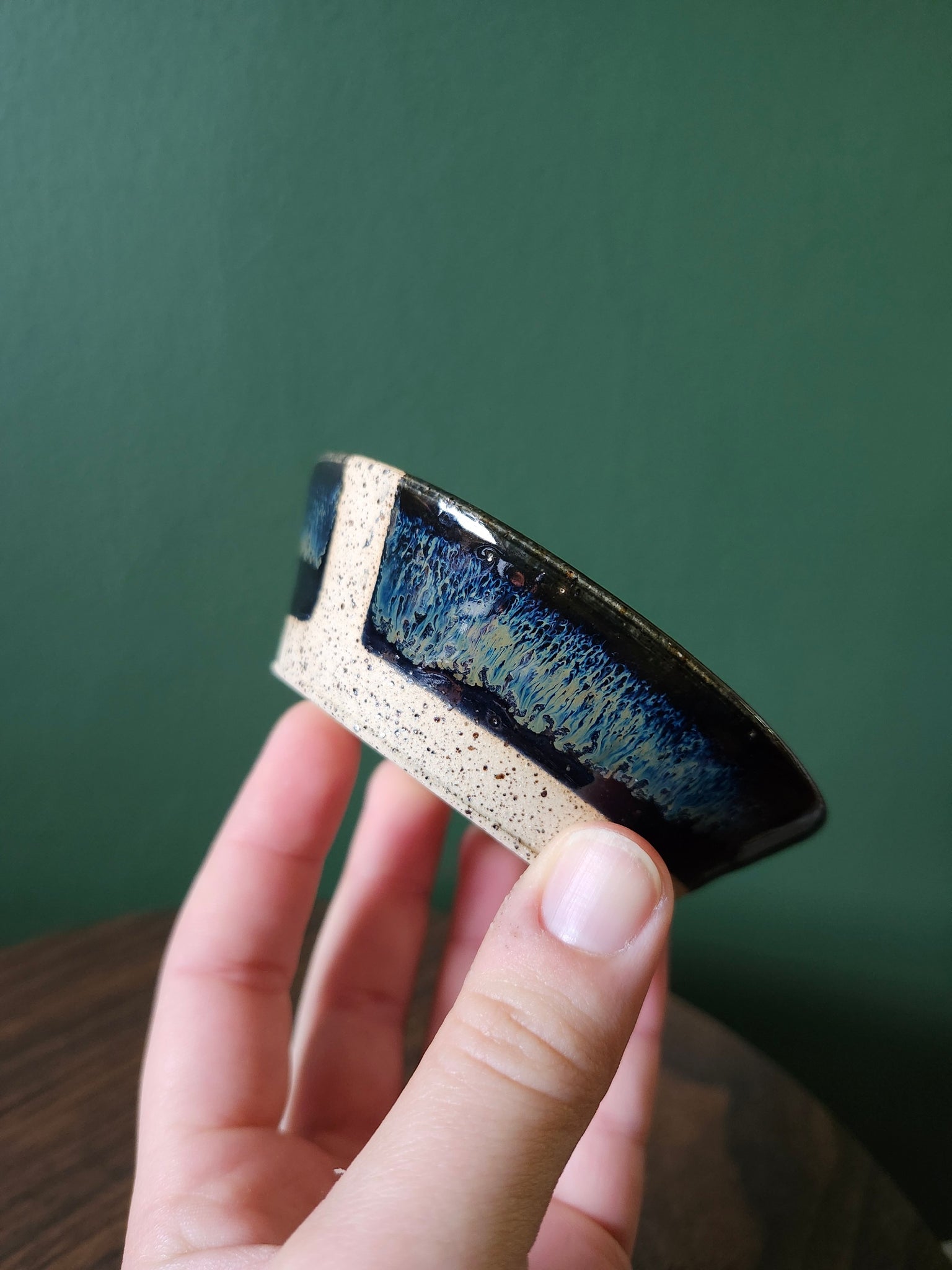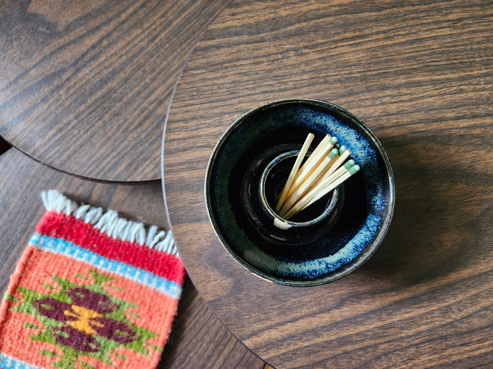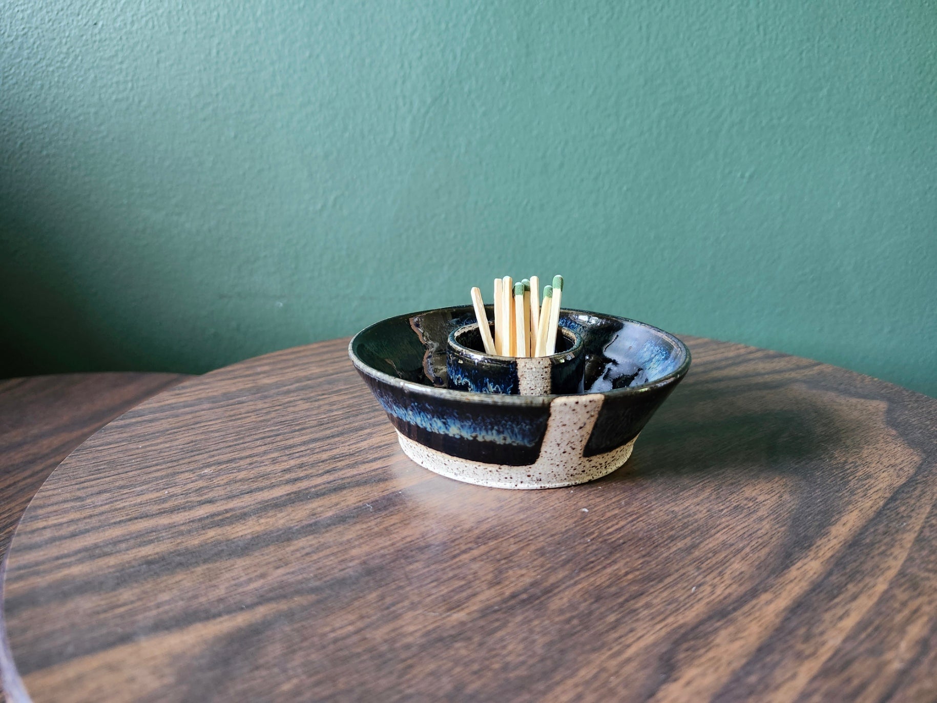A stoneware match striker. Each dish has an unglazed strip on the side to strike the matches. When using, please be sure to purchase "Strike Anywhere" matches.