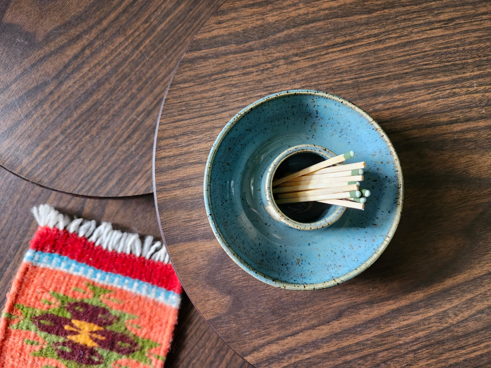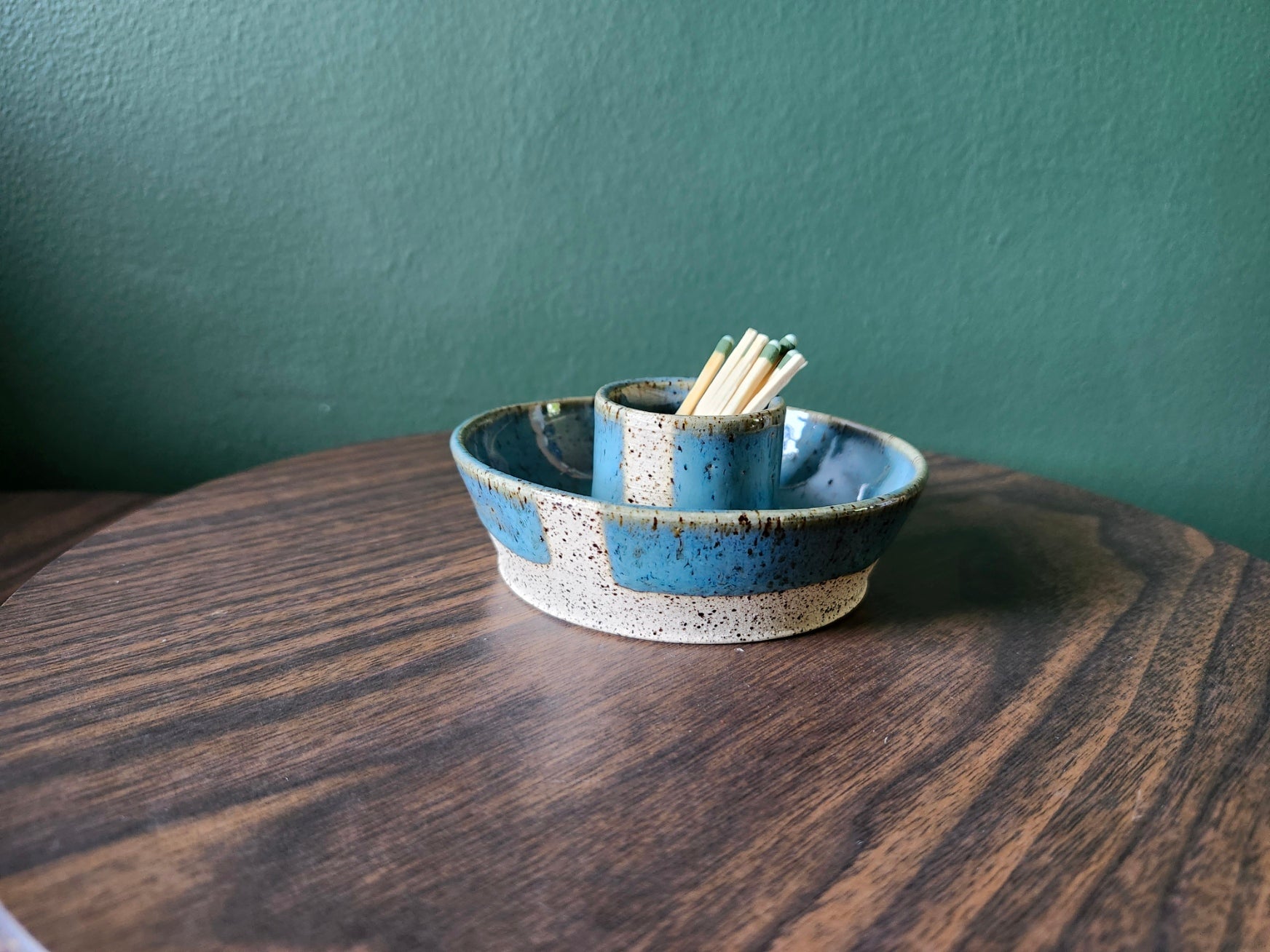 A stoneware match striker. Each dish has an unglazed strip on the side to strike the matches. When using, please be sure to purchase "Strike Anywhere" matches.